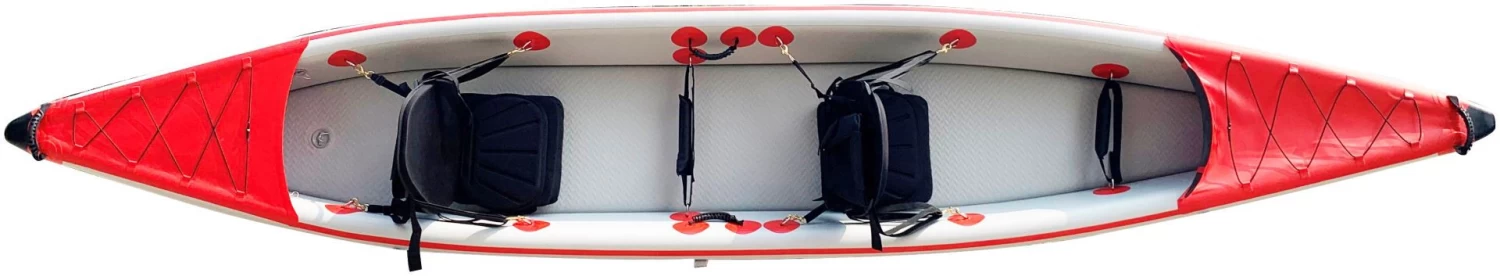 Deze opblaasbare tweepersoonskajak is gemaakt van 1000D versterkt PVC met dropstitch-technologie, waardoor hij licht, compact en enorm stijf is. Met een lengte van 4,70 meter biedt hij ruimte voor 2 volwassenen en bagage. Ook is het mogelijk om één stoel bij te plaatsen om zo ruimte te geven aan 1 extra volwassene.