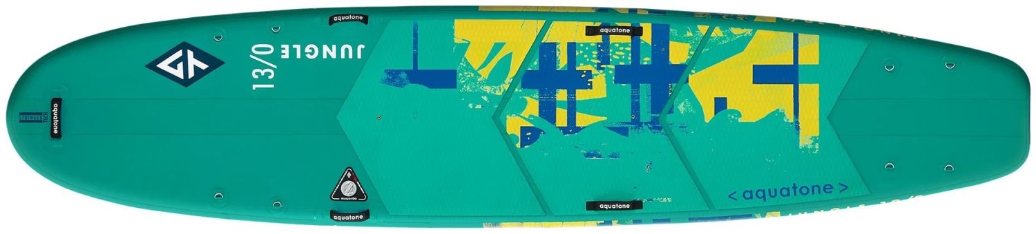 De Aquatone Jungle 13’0 SUP is een royaal 13′ (396cm) lang board, dat een zeer groot platform biedt om ervoor te zorgen dat de twee rijders genoeg ruimte hebben om te bewegen en niet tegen elkaar aan te botsen. Een perfecte 6″ (15cm) dikte biedt ultieme veiligheid voor nieuwe rijders en voor meerpersoonsritten. De Jungle 13’0 is uitgerust met twee mastvoeten voor de installatie van extra zeilen. Dubbele insteekvinnen maken het gemakkelijk om een rechte koers in het water te houden. Dit is een board voor gebruikers van alle niveaus en maten, ideaal voor gezinsuitstapjes, SUP-scholen en verhuur.